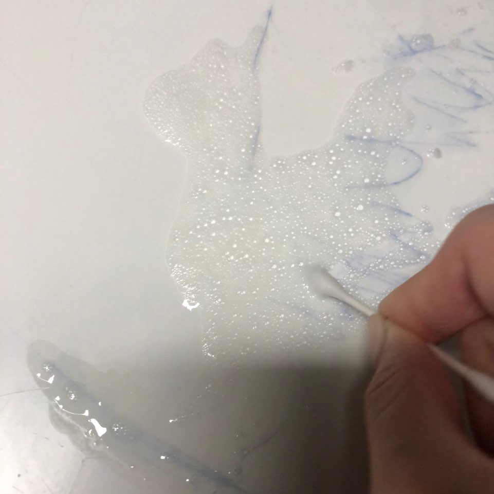 아세톤을 부어놓고 1-2분만 지나도 약간 볼펜자국이 불어오르면 휴지나 면봉으로 문지릅니다.