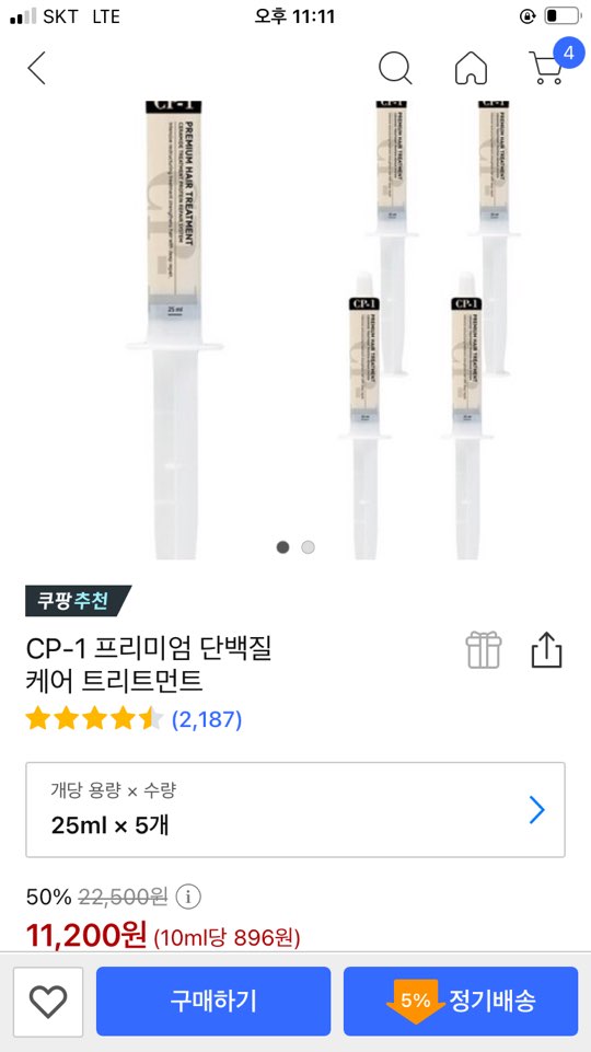 올리브영에서도 낱개로 구입이 가능하고, 쿠팡에 검색하니 5개에 11200원에 팔더라구요. 저는 쿠팡으로 구입해보았습니다. 계산해보면 1회에 2240원인데, 미용실 클리닉 가격과 비교할 수가 없지요?! 비싼 팩 1번해주는 것보다 1일1팩하는 것이 더 효과가 좋듯이! 요것도 1달에 1번 미용실가서 클리닉받는 것보다, 일주일에 1번씩 헤어팩해주는게 더 효과가 좋은 것 같아요! 가격도 비교불가구요 ㅎㅎ
