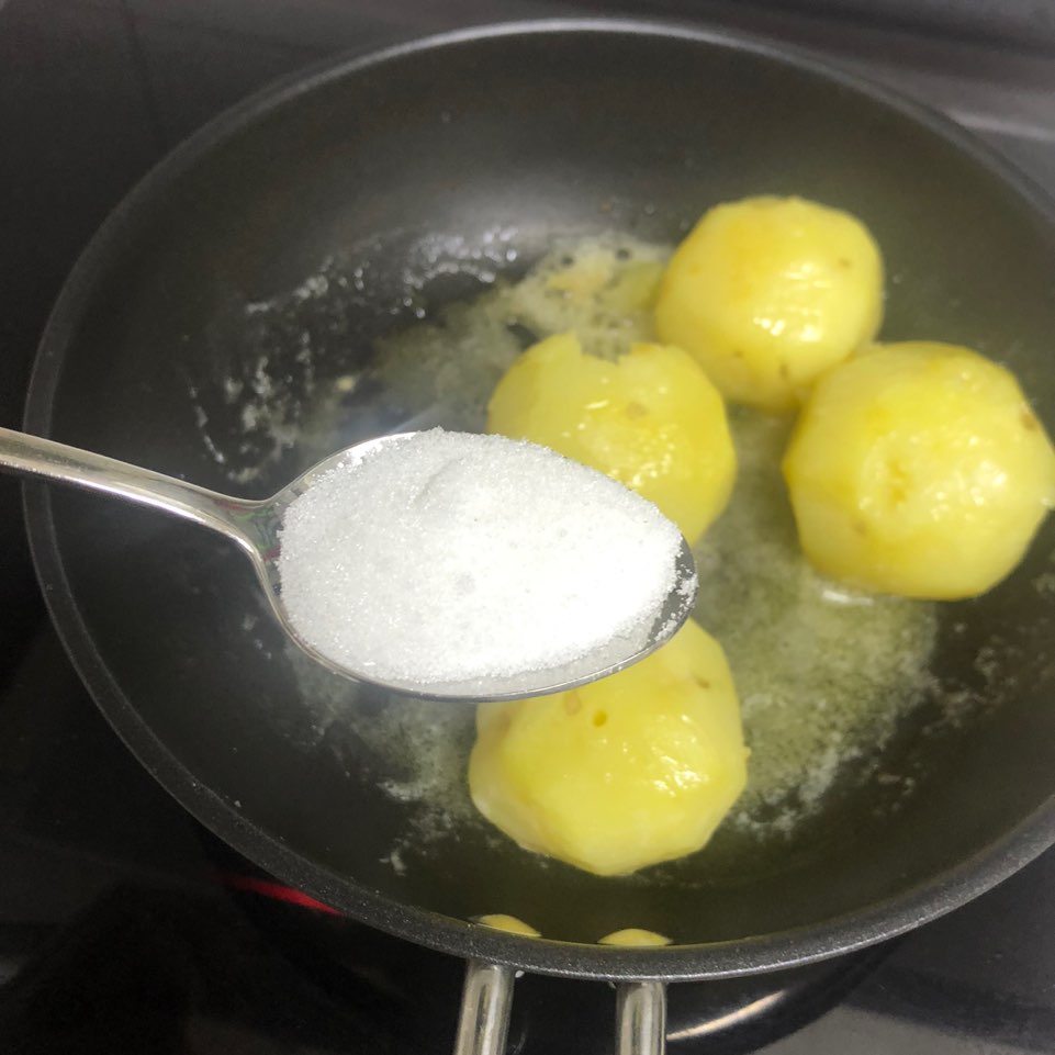 3. 설탕 1스푼을 넣고 골고루 묻혀줍니다. 설탕 대신에 꿀을 넣으셔도 됩니다 : ) 그리고 노릇노릇해질때까지 구워줍니다! 중강불로 겉면을 살짝 바삭하게 구워주시면 좋아요!