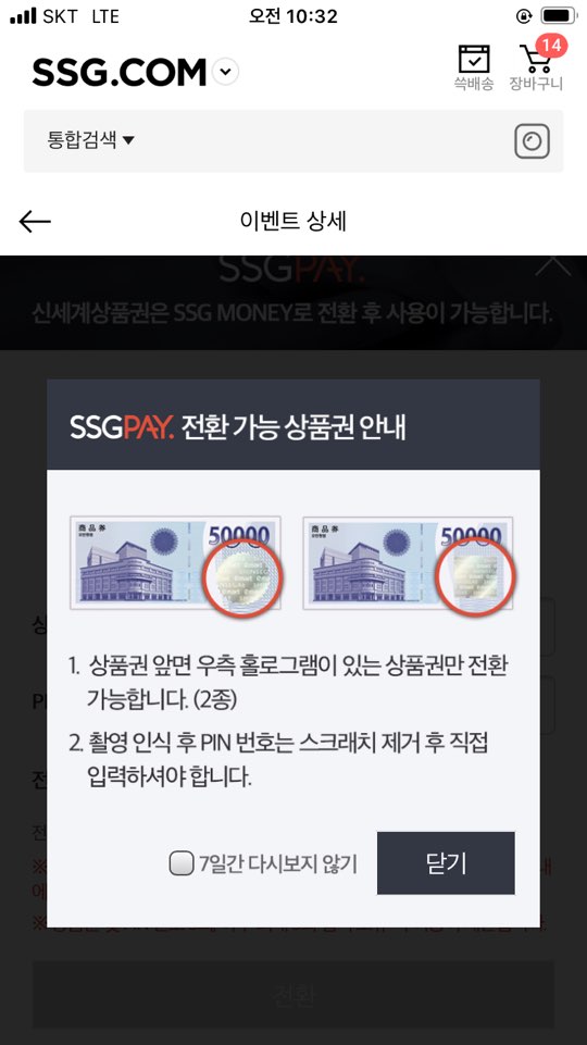 그런데!! 키오스크에서 교환한 상품권들은 홀로그램이 없어서 SSG 슥페이 머니로 교환이 안된답니다! 그럴땐 어떻게 하면 되냐!?!