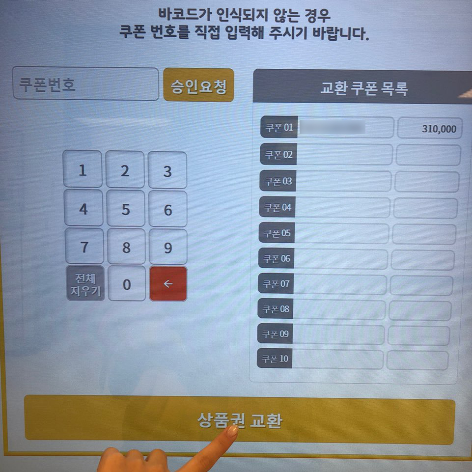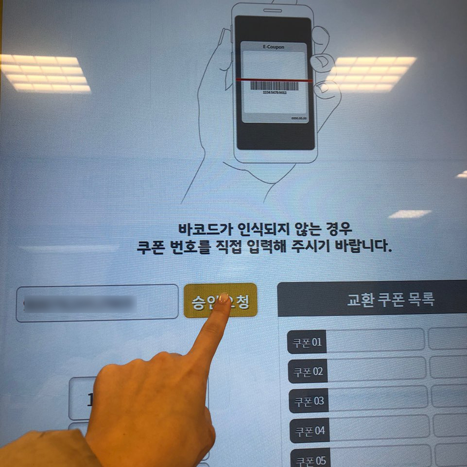 그 다음 모바일쿠폰 바코드를 키오스크 바코드 인식창에 비추어 주면 자동으로 쿠폰번호가 입력이 됩니다! 쿠폰번호가 인식이 되지 않는 경우에는 모바일 쿠폰에 나와있는 번호를 직접입력해주면 됩니다~ 그리고 노란색 '승인요청' 버튼을 누르면 목록에 쿠폰이 추가 됩니다. 가지고있는 모바일 상품권을 모두 등록한 후 '상품권 교환'버튼을 눌러주세요!