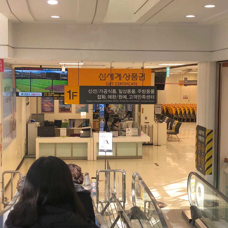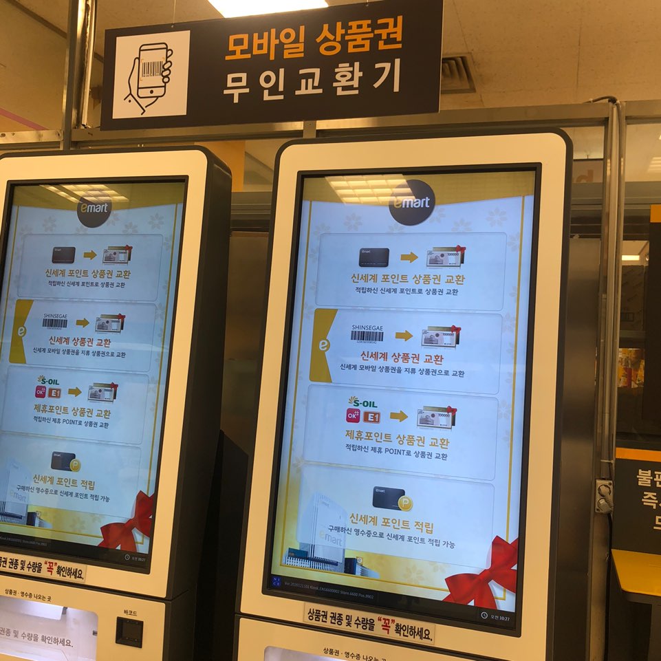 이마트 연제점은 에스컬레이터를 타고 내려오면 1층에 '신세계 상품권 안내데스크'가 바로 보입니다. 그 맞은편에 '모바일상품권 무인교환기(키오스크)'가 있어요!