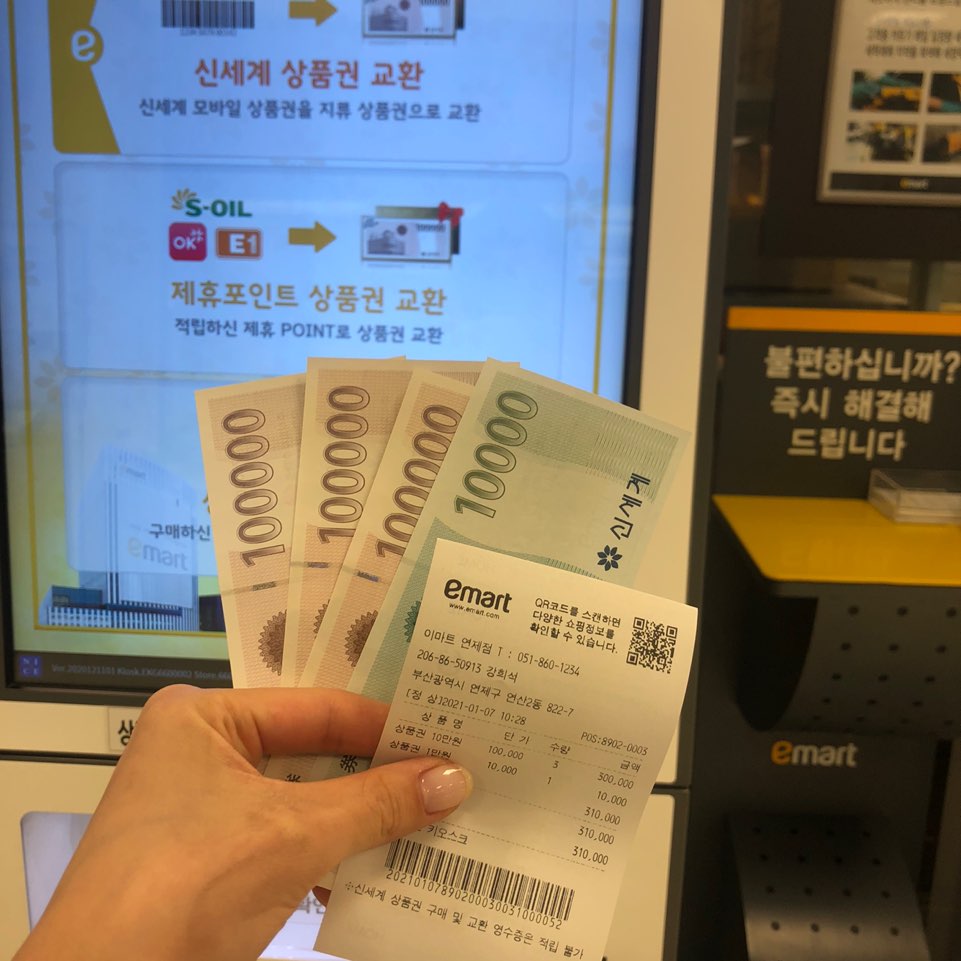 안녕하세요 : ) 최근에 통신사 유선 상품을 가입했더니, 사은품으로 신세계 이마트 상품권 모바일 쿠폰을 문자로 보내주셨어요! 이마트상품권 모바일 쿠폰을 바로 SSG슥페이 포인트로 전환해서 온라인 쇼핑을 하면 너무너무 좋겠지만! 1. 이마트(신세계백화점X, 이마트O)에 직접 가서! 2. 키오스크에서 지류 상품권으로 교환을 하고!(홀로그램상품권으로 교환) 3. 이마트/신세계백화점/슥페이 어플에 들어가 슥페이머니로 변경! 해야 하더라구요~~ 저희 집 주변에 신세계백화점이 가까이 있지만.. 이마트가 없어서 꽤 멀리나와 상품권을 교환해야했답니다~ : )