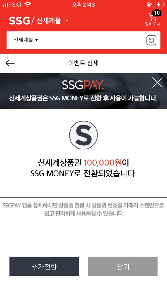 06. 전환 완료! SSG PAY어플은 바코드스캔 기능이 있어 정말 간단하게 상품권 전환이 가능합니다 : )