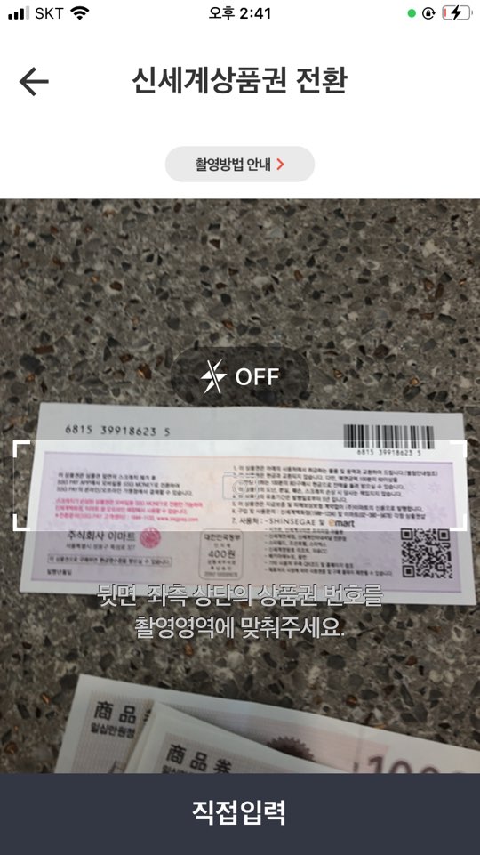 03. '신세계상품권 전환'을 누르면 바로 상품권 스캔촬영 카메라가 실행되고 바코드를 화면에 잘보이게 가져다대면 인식이 되어 상품권 번호가 저절로 입력이 됩니다.