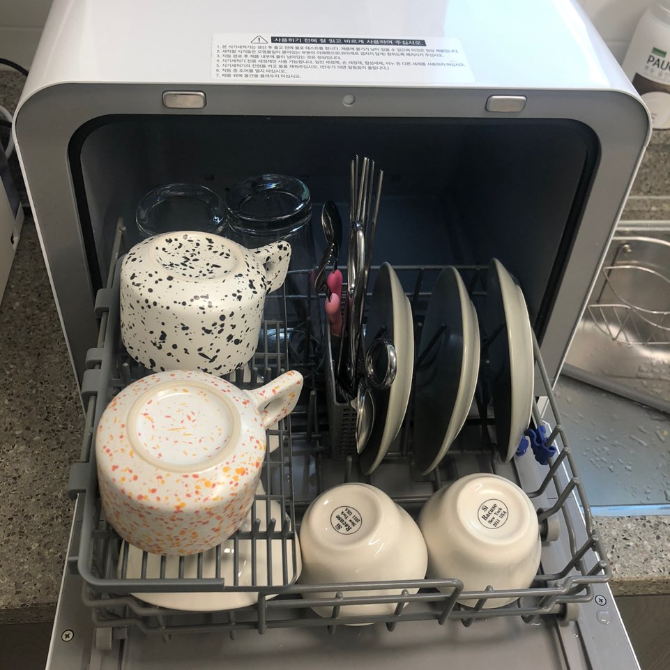 04. 설거지 할 식기를 넣어줍니다. 저는 유리컵2, 머그컵2, 밥그릇2, 국그릇2, 접시3, 숟가락2, 젓가락2세트, 가위, 아기숟가락, 아기포크 이렇게 들어가니 꽉찼습니다. 3인가구에서 사용하기에는 조금 작은 크기이고 1-2인가구에서는 충분히 잘 사용하실 것 같아요 : )