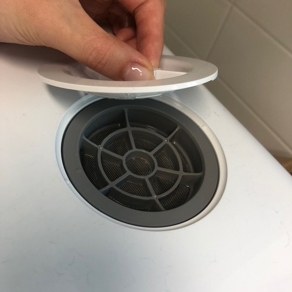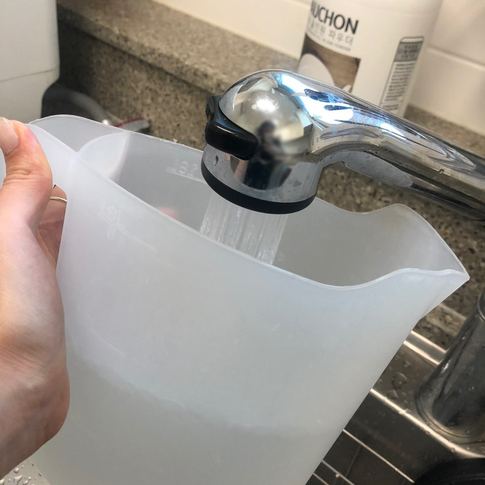 윗쪽에 급수를 하는 구멍이 있고 뚜껑으로 덮혀져 있습니다! 한번 작동할때 5L의 물을 넣는데 함께 딸려오는 1.8L컵으로 3컵정도 넣거나 싱크대 수전 줄을 길게 빼서 직접 급수를 하는 방법도 있습니다!