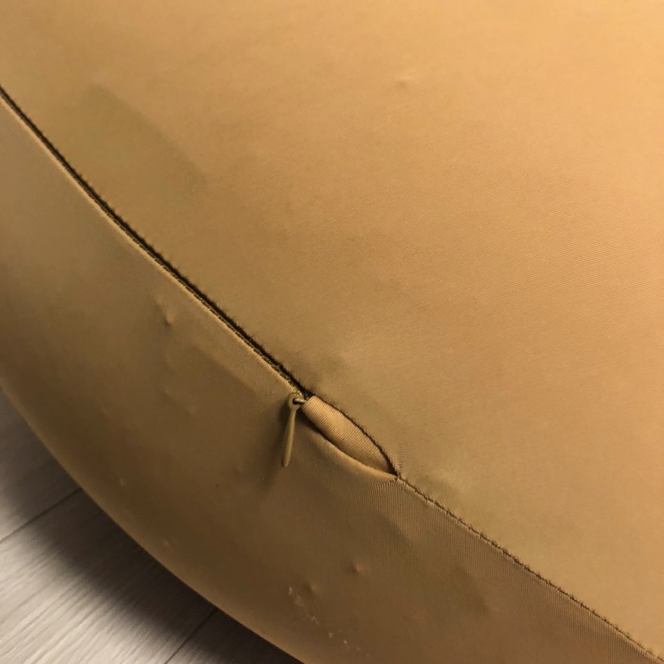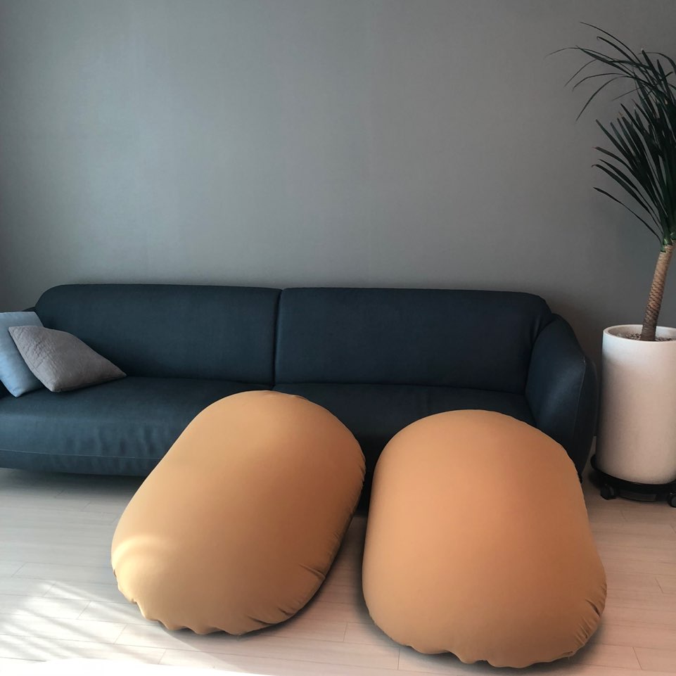 앉았다가 일어나면 이렇게 모양이 잡혔다가 다시 눕혀놓으면 빵빵한 모찌모양으로 복원이 되어요! 천이 늘어나거나 충전재가 눌리거나 하는 것 없을까 걱정했는데 복원률이 좋네요 : )