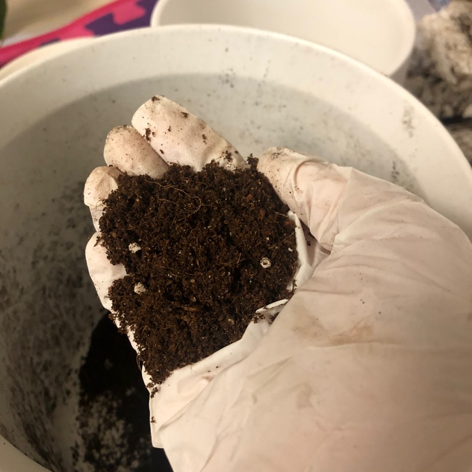 03. 흙을 화분에 1/3정도 꾹꾹 눌러 담아줍니다. 원하시는 식물의 높이에 따라 높낮이를 조절해주세요! 쿠팡에서 '혼합배양옥토' 흙을 아주 저렴하게 구입했는데 초코파우더처럼 까맣고 촉촉하면서도 영양분이 있어보이는게 흙이 좋아보였어요~ 벌레도 없었구요.