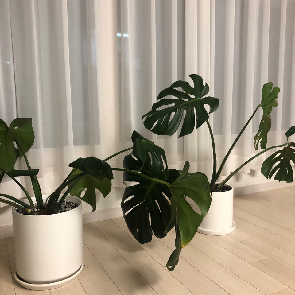 짜잔~ 이게 바로 그 문제의 저희집 몬스테라입니다 정말 사방팔방으로 잎이 나있죠 ㅜㅜ 왼쪽과 오른쪽 잎의 풍성함 차이도 크고요.. 물은 주기적으로 주는데 저희집이 많이 건조한편이라서 살짝 시무룩 해졌더라구요 ㅠㅠ 신경을 너무 안쓰고 있었나봐요.. 흙이 마르지않게 해주고 잎에 분무기도 뿌려주고 신경을 잘 써주어야할 것 같아요 : )