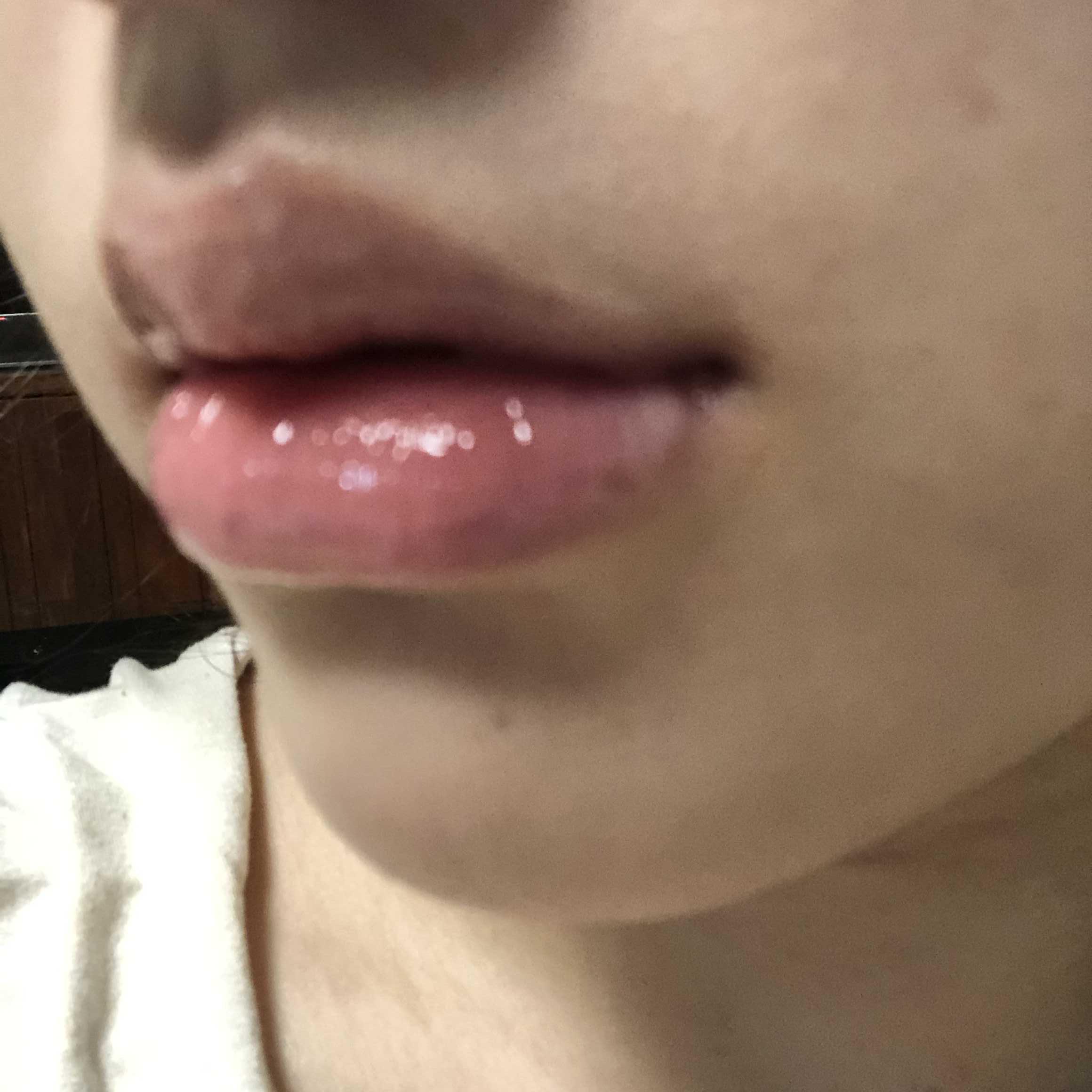 다음 날 아침 자면서 마른 건지,, 먹은 건지,, 베게에 묻힌건지,, 일단 입술이 말라져 있답니다 : ) 그래도 한번 입술을 물티슈로 닦아주고 상태를 확인해 봅니다.