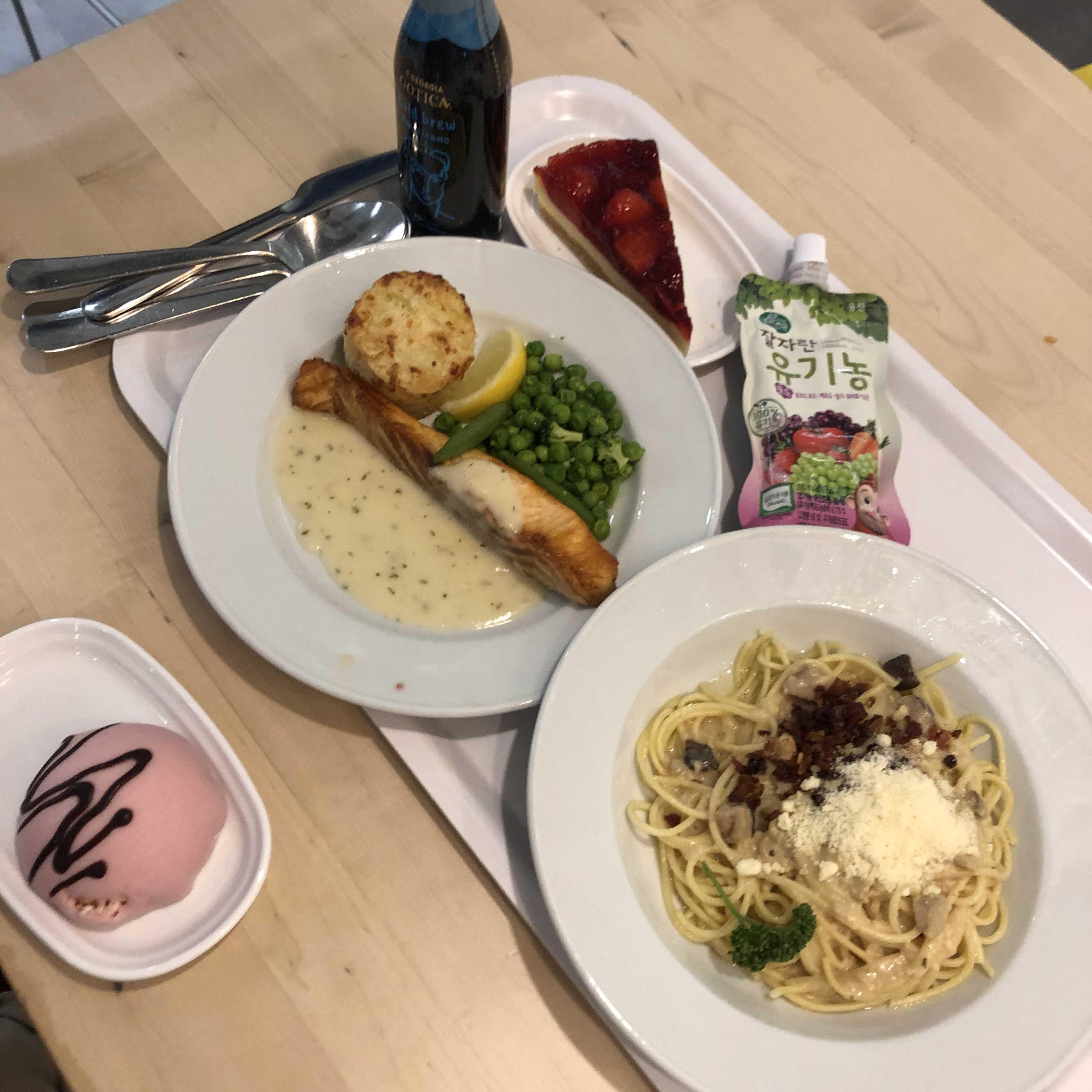 저희는 버섯파스타, 연어필레, 케이크 2종류, 치킨, 초콜릿 크루아상, 커피, 아기주스를 구입했습니다! 케이크는 냉동한 걸 녹여서 진열해놓는 것 같았어요~ 케이크 하나가 얼어있어서 서걱서걱 씹히더라구요 ^^; 치킨은 매콤하고 짭짤한게 맛있었어요! 2000원 가격대비 정말 추천합니다! 초콜릿 페이스트리도 맛있었어요 : )