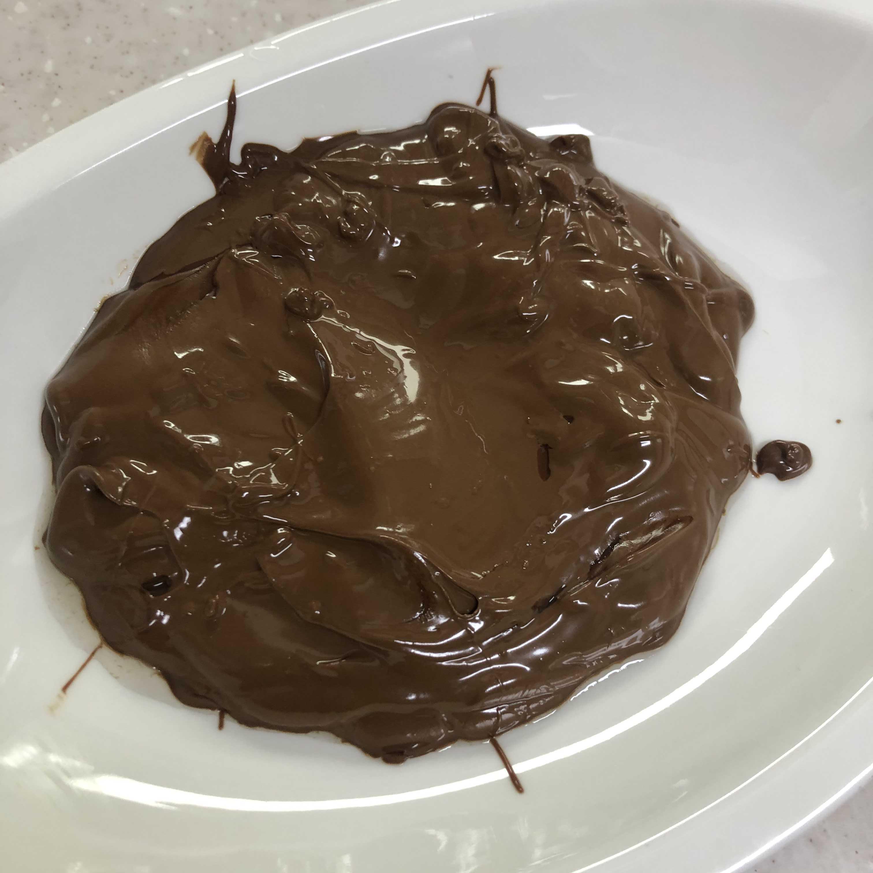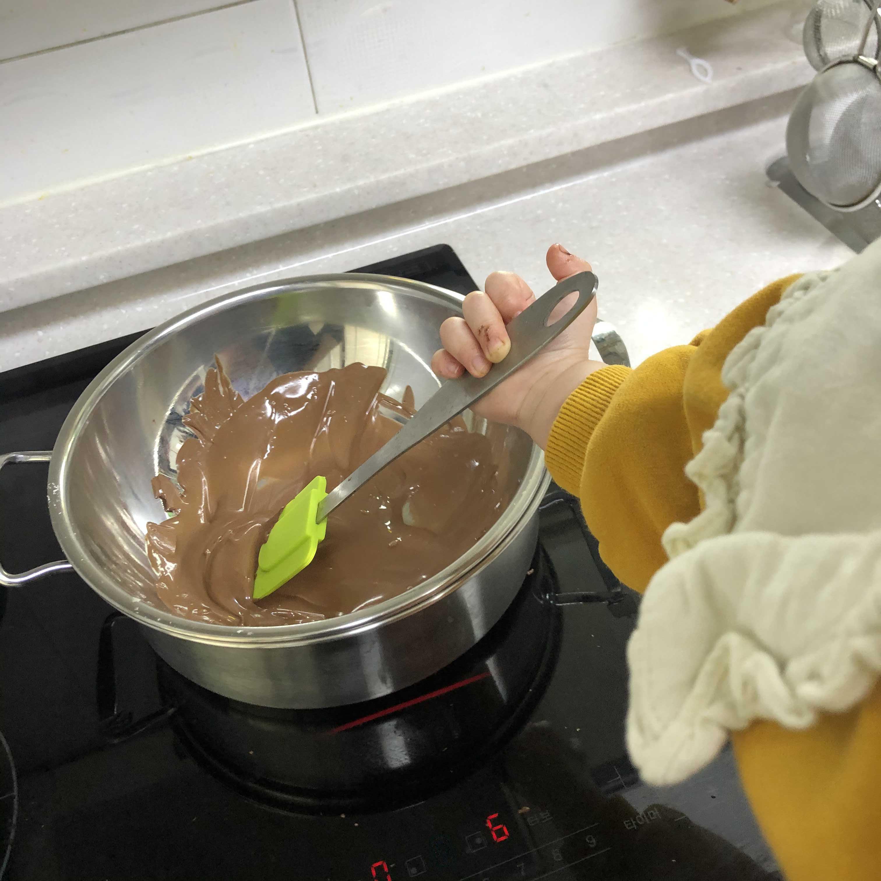 02. 초콜릿을 잘게 부숴 중탕을 해줍니다. 스파츌러로 저어주면 금방 녹습니다! 물이 들어가지 않도록 주의해주세요 : )