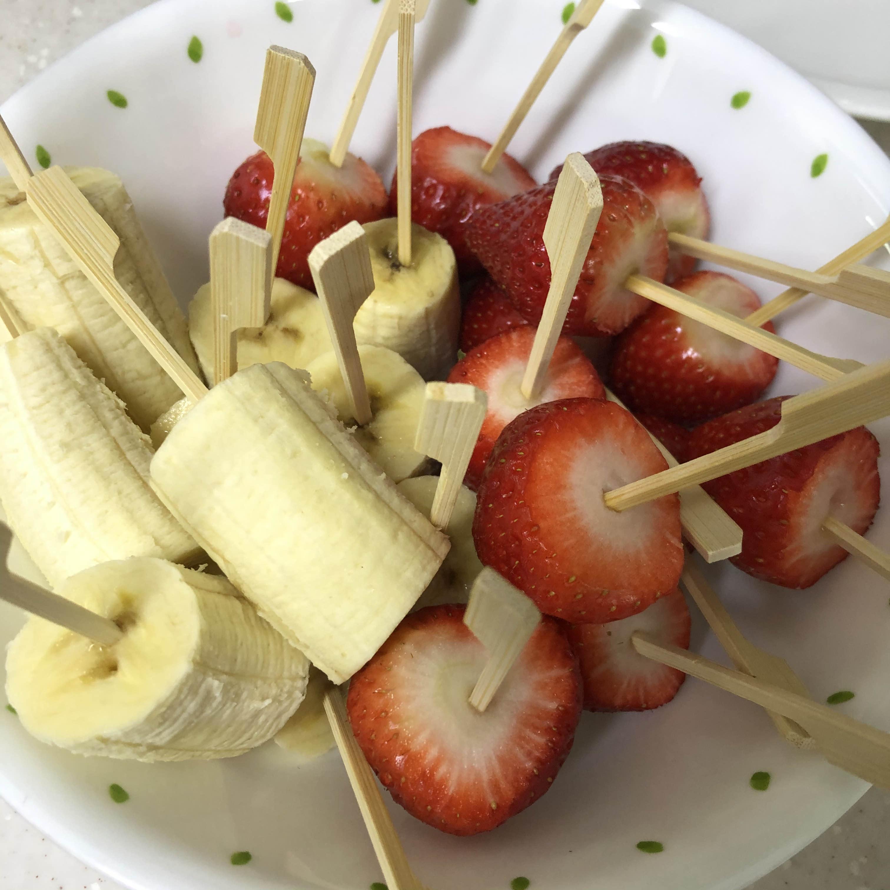 01. 먼저 과일을 적당한 크기로 잘라준 다음, 과일꽂이를 꽂아줍니다.