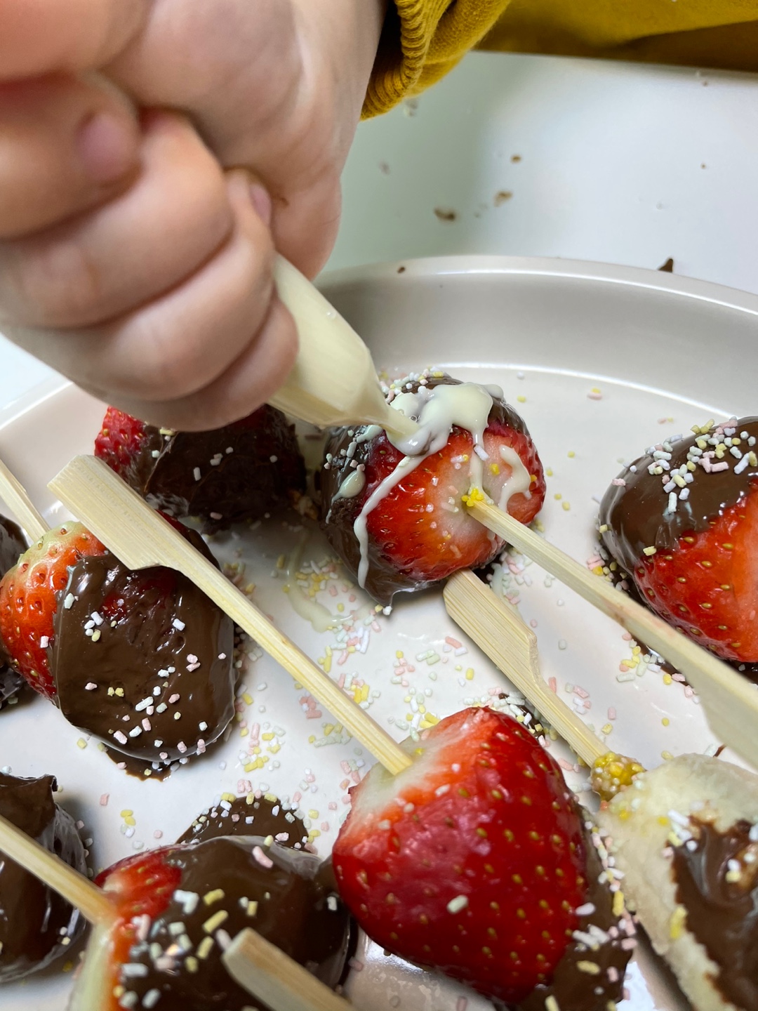 05. 초콜릿 위에 스프링클을 뿌려줍니다. 밋밋한 초콜릿에 가루를 뿌리니까 그럴듯 해보이죠~?
