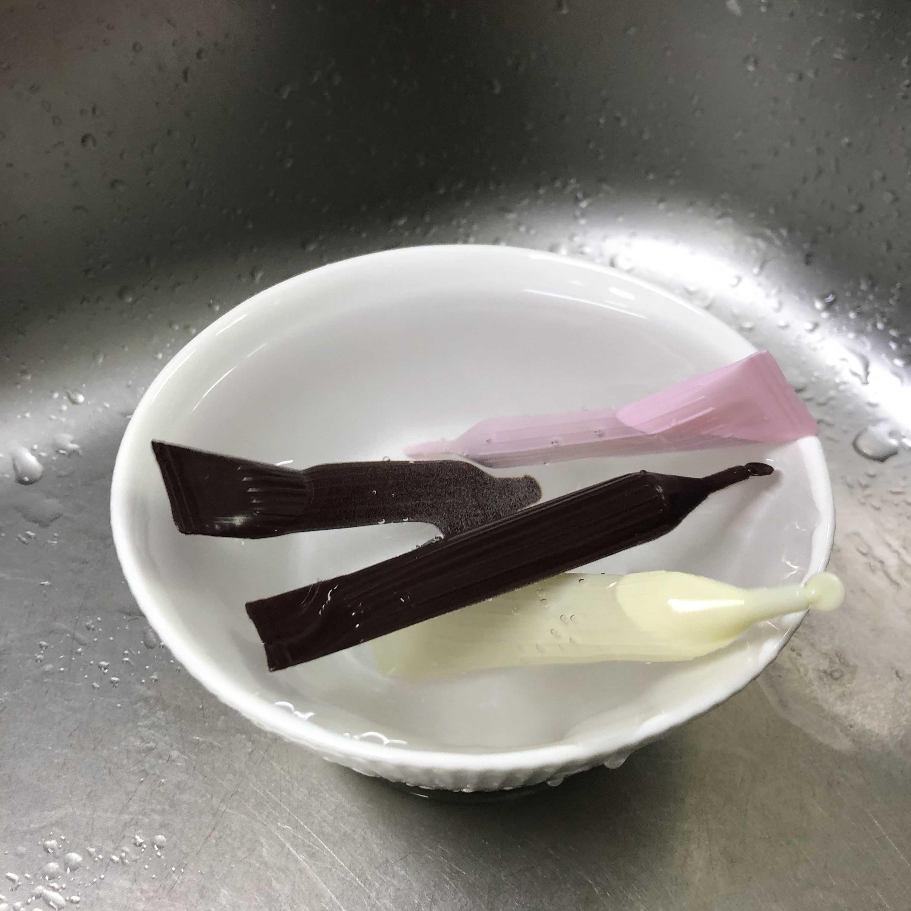 03. 얼초 공룡만들기 안에 들어있는 재료들을 꺼내줍니다. 초코펜들은 따뜻한 물에 넣어 녹이고 스프링클을 봉지에서 꺼내줍니다.