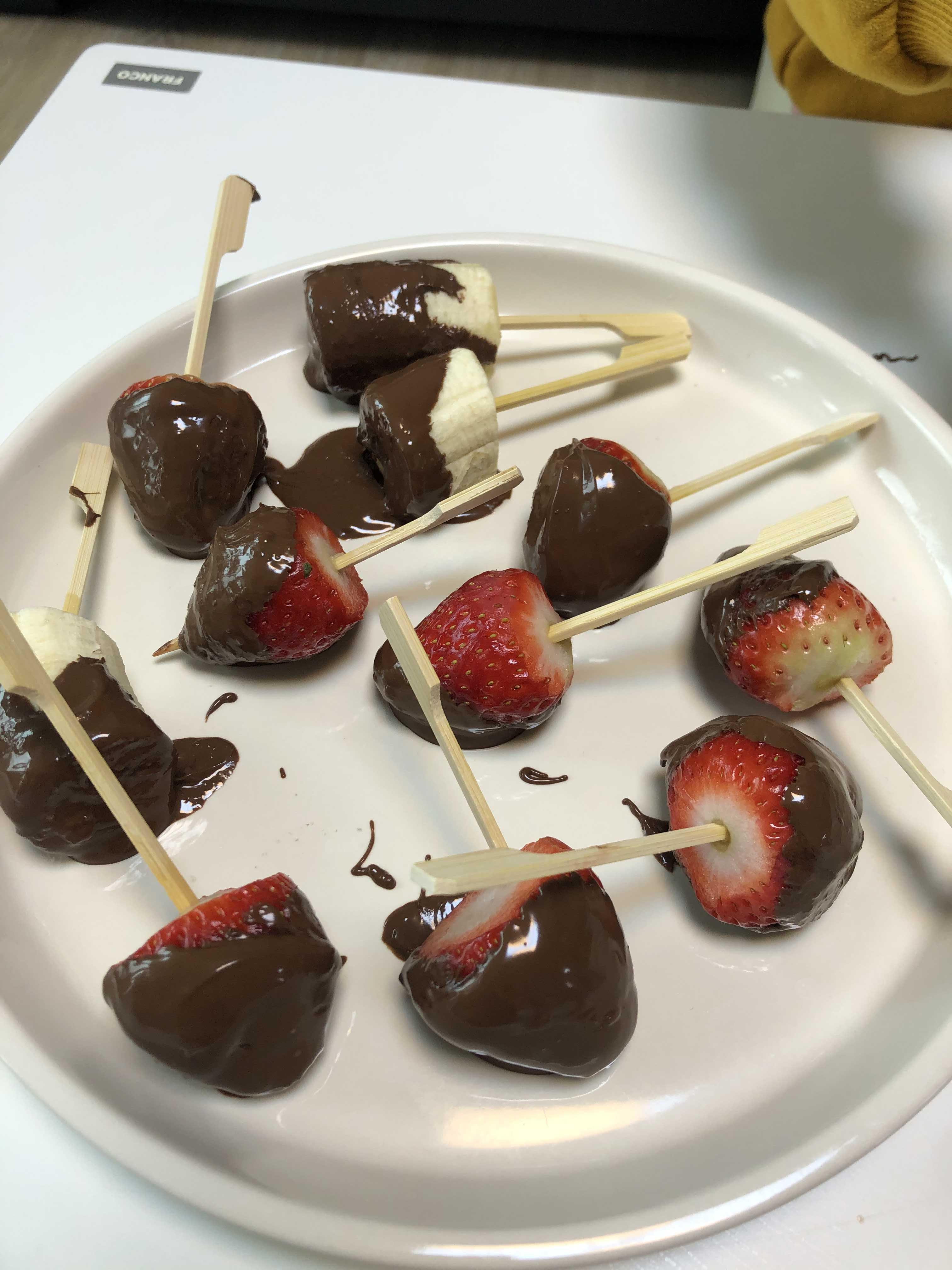 04. 과일에 초콜릿을 골고루 묻혀줍니다! 몇개는 입속으로 넣어줍니다ㅎㅎ 딱딱하게 굳은 것 보다 초콜릿이 녹아있을때 더욱 맛있더라구요! 바나나초코 너무 맛있어요 ㅜㅜ