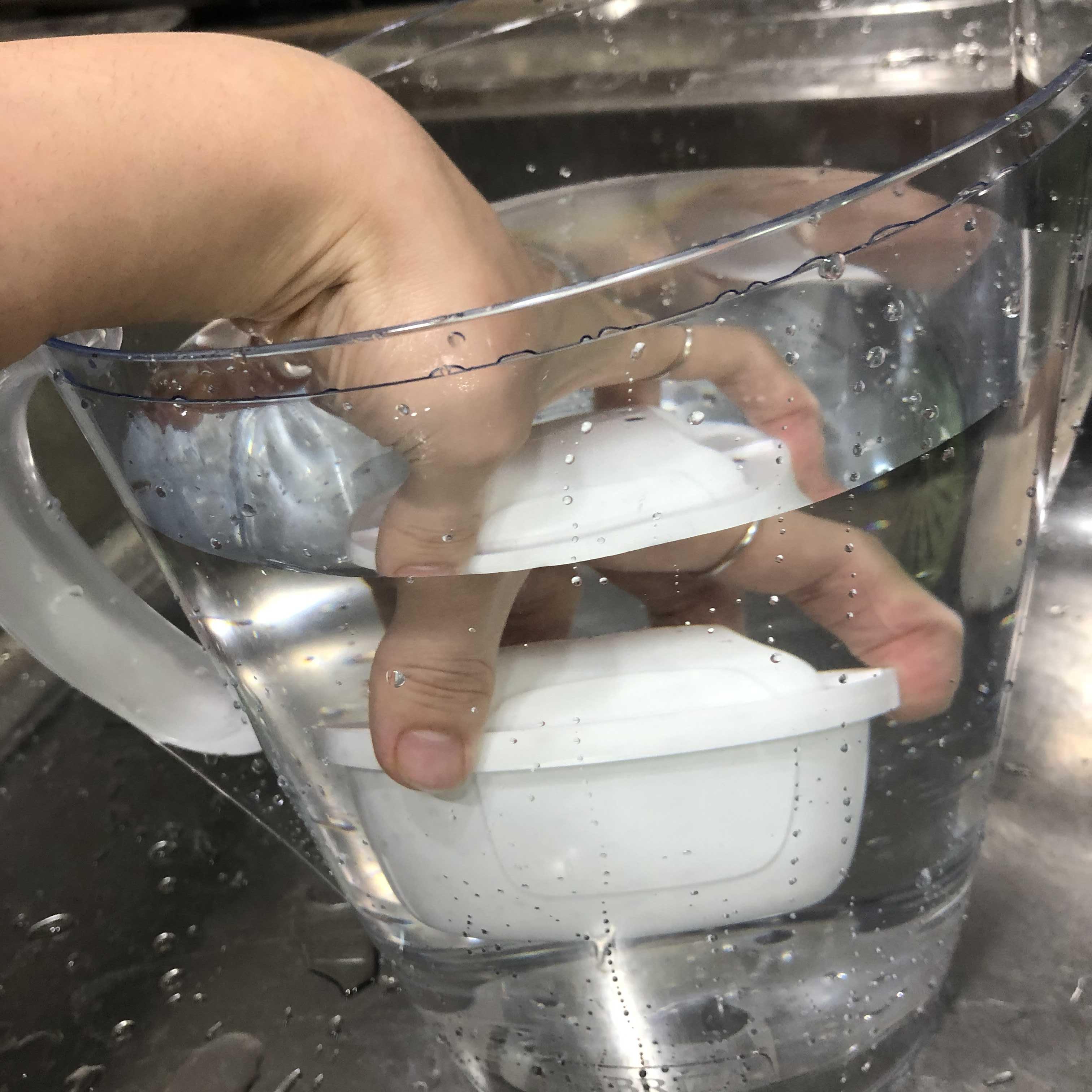 2. 물통에 물을 끝까지 받은 다음 필터를 물통에 넣고 기포가 나올때까지 좌우로 흔들어줍니다.