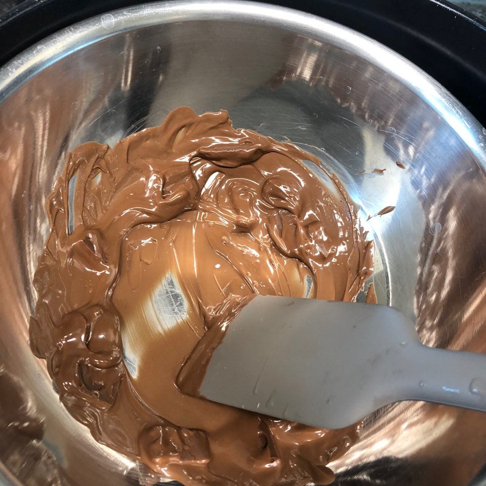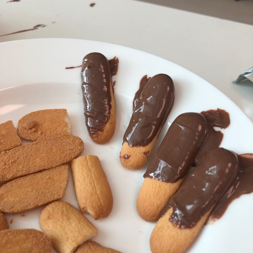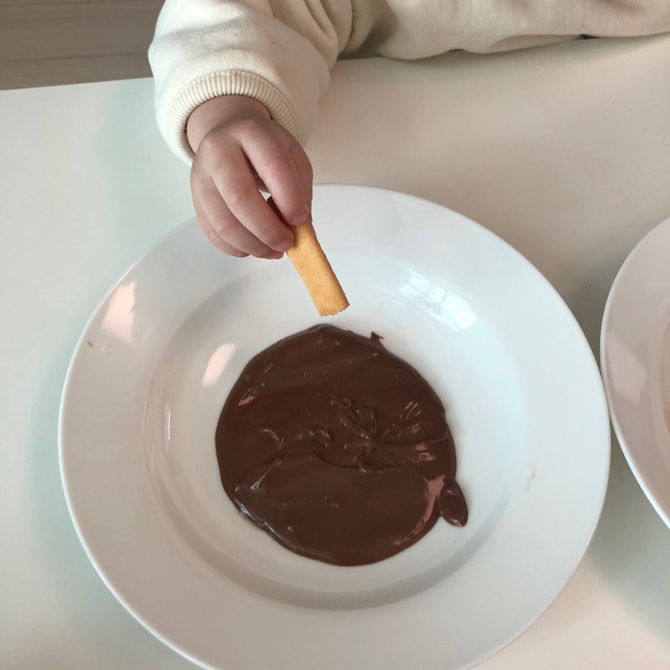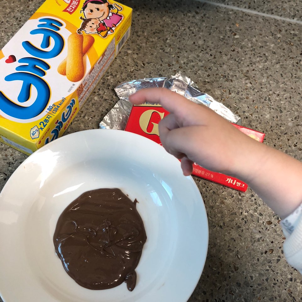 과자 끝을 잡고 초콜릿에 퐁당퐁당 골고루 묻혀서 가지런히 두어요~