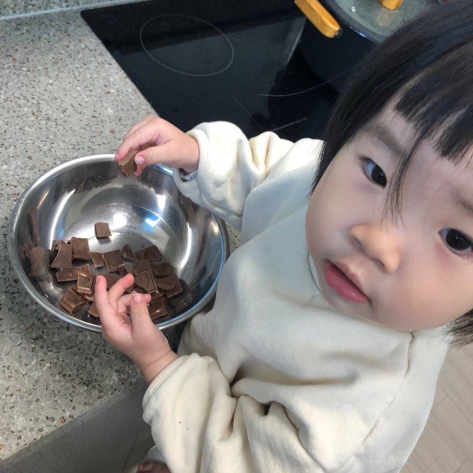 초콜릿을 까서 아이와 함께 초콜릿을 열심히 부숴줍니다! 잘게잘게 부수면 중탕이 더 빠르게 되겠습니다 : )